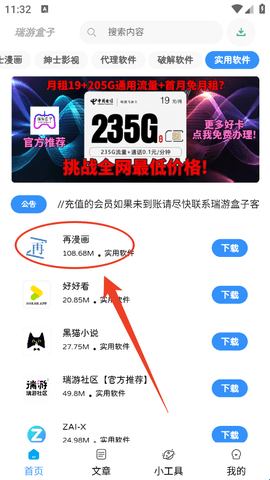 1、进去之后可以直接找需要的应用,例如我想下载一款漫画APP,找到刚刚更新的这个软件“再漫画”,先点击进去看看。