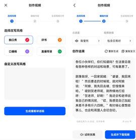 识别之后点击创作视频的话,还支持将这段视频内容进行改写,生成脱口秀、评书、口播稿等内容。