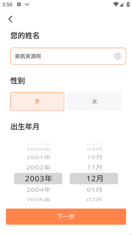 1、使用手机号完成登录/注册后,按照步骤填写个人信息,姓名、性别、出生年月等。