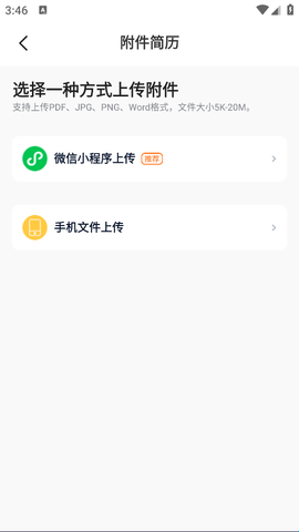 2、然后这里有两种上传简历附件的方式,分别是:微信小程序上传、手机文件上传。