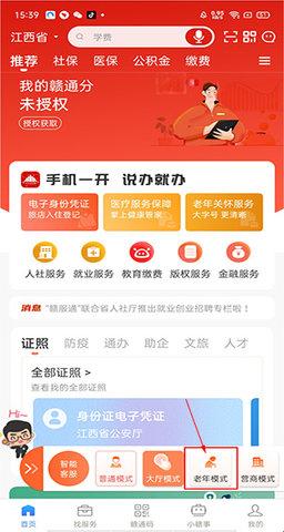 2、进入到赣服通软件中后,点击右下角的“老年模式”。