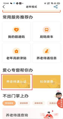 1、在“赣服通”首页点击搜索,输入养老认证,点击进入服务。