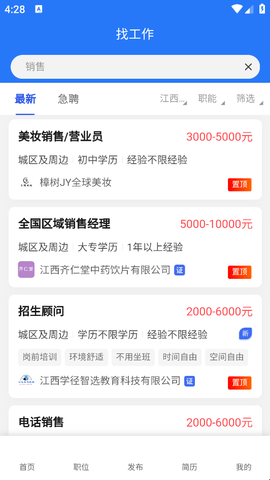 3、支持搜索职位,输入地点、期望薪资、职位、福利待遇、经验条件精准筛选匹配。