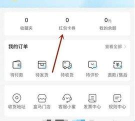 1、进入盒马鲜生界面,打开红包卡券。