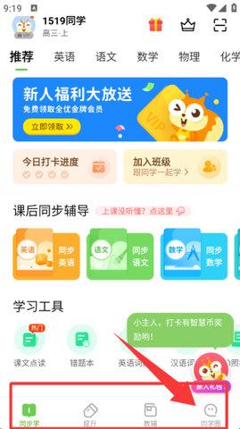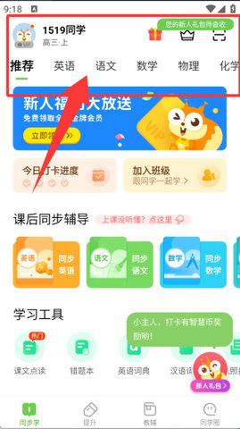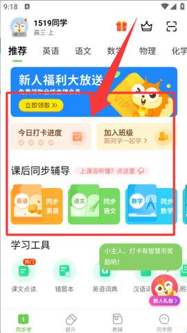 3、点有班级的用户加入到班级中,可以看到老师布置的作业、学习内容、打卡学习等功能。
