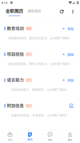 4、然后继续去添加教育培训、项目经验、工作经历等,全部完成添加后就可以制作好你的简历了。