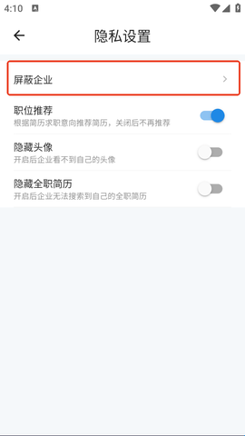 3、在隐私设置页中继续点击“屏蔽企业”。