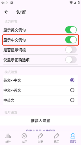 3、大家在设置页将显示中文例句后面的这个开关开启就行了。
