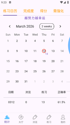 2、在“练习日历”中就能看到每天的学习数量、准确率。