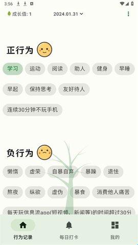 1、打开自律树软件后,用简约的功能将用户所做事情进行了详细的分类,完成或负事件都可以进行记载。