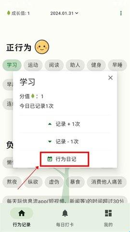 1、来到自律树中后,首页会显示正在行为、负行为等两种方式。