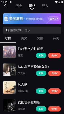 3、这里会有很多网络素材,有歌曲素材、美文素材、文案素材等,选择感兴趣的素材去制作。