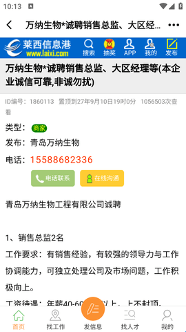 4、找到感兴趣的工作后就可以点击进入,直接电话联系应聘。