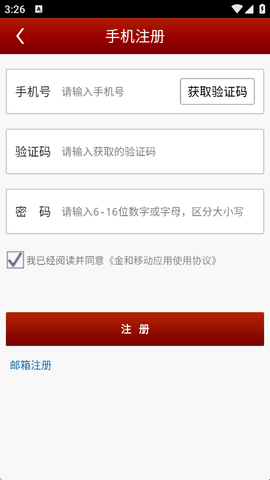 2、在手机注册界面中,输入手机号、验证码、密码后即可点击“立即注册”按钮。