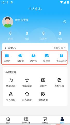 3、需要购买之后的用户可以在“我的”界面中寻找购买记录、待发货、售后等等。