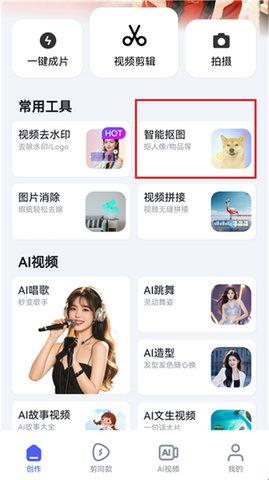 1、在360AI智剪平台的创作页面,点击【智能抠图】功能。