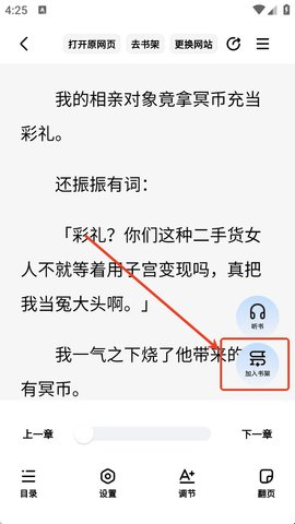3、点击封面来到小说阅读界面,右下角会有一个“加入书架”按钮,点击一下。