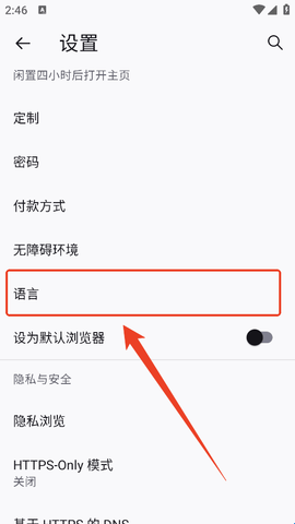 1、我们在设置页找到【语言】功能,通常在“设为默认浏览器”上方。