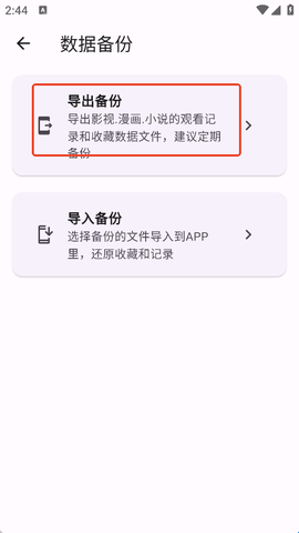 2、点击“导出备份”此时就会将用户收藏的漫画、小说一键导出到手机中。