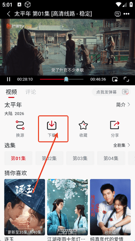 2、几秒缓存过后,即可点击中间的“下载”按钮,下载想看集数。
