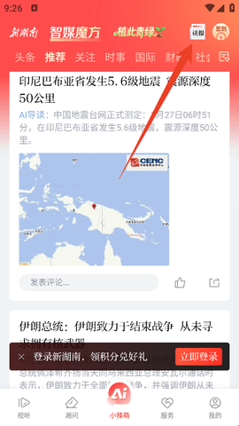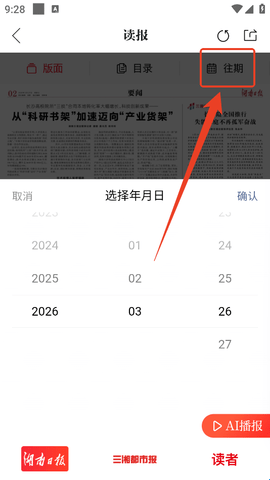 1、进入软件后直接点击右上方的“读报”。