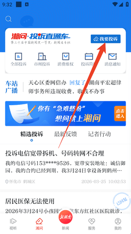 1、我们直接进入“湘问”页面,然后点击上方的“我要投诉”。