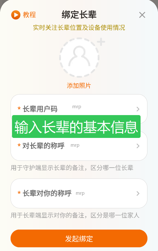 3、输入长辈详细信息,最重要的是手机号信息后点击确定。