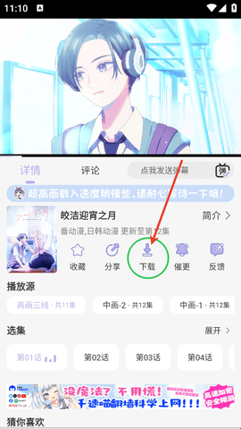 下载功能在动漫视频播放画面的下方,用户点击“下载”之后就开始选择选择集数。