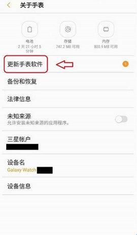 信息主要显示手表电池容量、剩余存储和运存等状态。Galaxy Watch内置4GB存储空间,主要用来装应用、相片、音乐等内容。