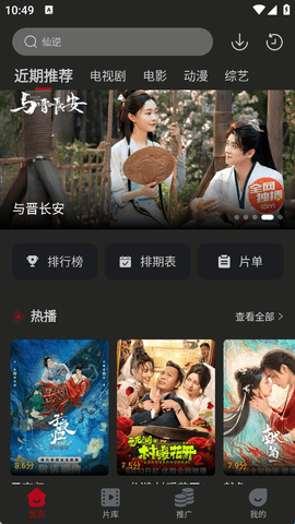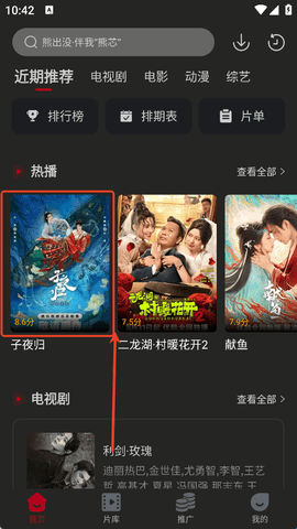 1、首页界面是最近更新的影视内容,有热播剧、推荐剧、电视剧、电影题材内容。