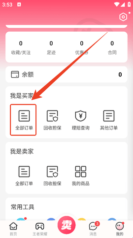 2、然后确定你是买家还是卖家,点击对应下方的“全部订单”。