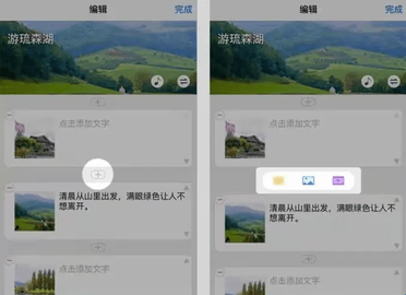 8、在任意位置点击“+”号,会弹出插入选择框。你可以插入纯文字、图片或视频。