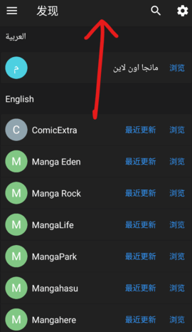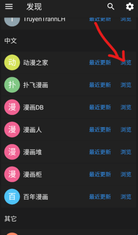2、自动跳转到发现界面,准备多个国家的漫画源,上下滑动就会看到更多。