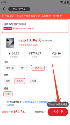4、最后选择相关型号、租期,填写收货地址,然后点击“去免押”就行了。