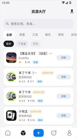 2、进入资源大厅,可选择下载表盘、工具、娱乐、游戏等多种资源。