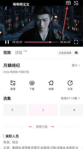 追剧喵视频播放界面中,稍作等待需要画面出现,点击右上角的“TV'(投屏)。