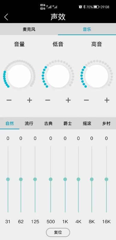 3、进入音乐模式的声效页面,可调节音量、低音、高音参数,也能选择自然、流行等不同音效风格,还可通过均衡器自定义频段参数。