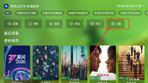 1、幸福年年tv首页最右侧会有一个“设置”按钮是,帮助大家设置自己的观看内容。