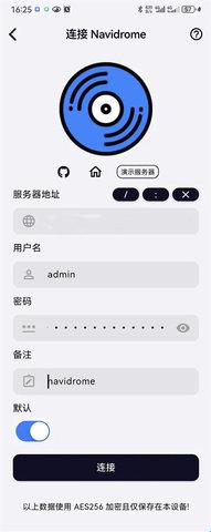 点击“Navidrome”选项,填入Navidrome服务器的地址、用户名和密码。