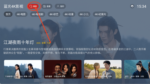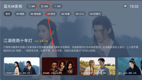 1、蓝光4K影视首页界面,最上方会有一个“直播”按钮,点击直接来到直播电视中。