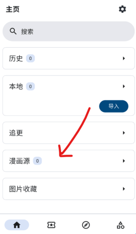1、来到venera漫画首页界面,点击“漫画源”进入按钮中。