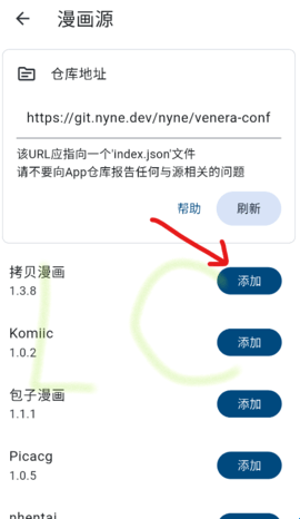 3、点击右下角的“添加”按钮,将复制的漫画源直接粘贴上,下方还有其他源的漫画也可以一键添加。