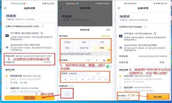 填写物品信息、快递公司,拍照并提醒客户支付。