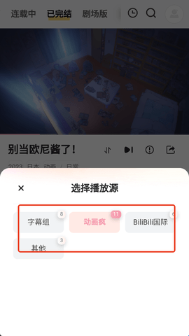 2、在下拉款中动漫源中挑选出,播放最流畅,画质最清晰的动漫,来一键更换。