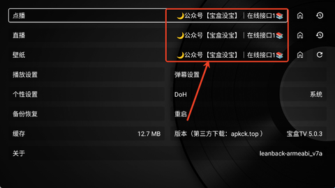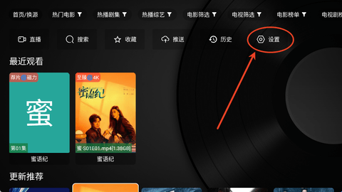 1、宝盒tv电视版任意一个界面中,点击右上角的“设置”按钮,查看详细功能。