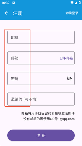 2、没有账号的用户,点击右上角的“注册”按钮,切换到注册界面,输入昵称、邮箱、密码等内容。