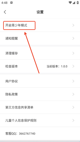 2、即可看到详细的设置功能,最上方就会有一个“开启青少年模式”。