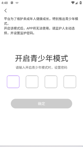 3、需要用户设置青少年密码,四位数确定之后,就可以点击确定按钮。