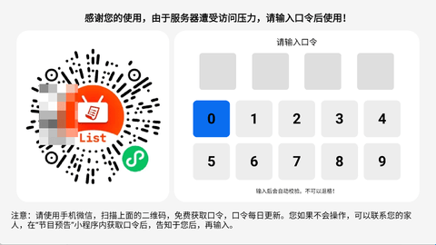 口令一直在变化,用户可以跟着步骤来寻找,请使用手机微信,扫描上面的二维码,免费获取口令,口令每日更新。您如果不会操作,可以联系您的家人,在“节目预告"小程序内获取口令后,告知于您后,再输入。