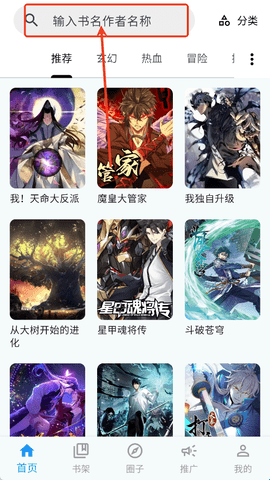1、漫星海漫画首页界面中,能看到首页推荐漫画内容点击左上角的搜索按钮。